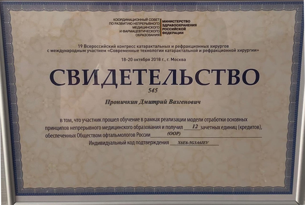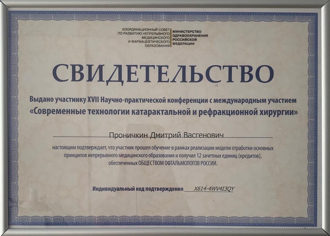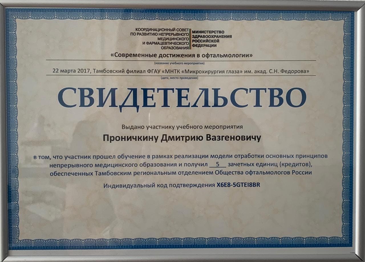 18.12.2015 года – удостоверение №682403249976 о повышении квалификации по дополнительной профессиональной программе «Офтальмология» — Федерального государственного бюджетного образовательного учреждения высшего профессионального образования «Тамбовский государственный университет имени Г.Р.Державина» медицинский институт