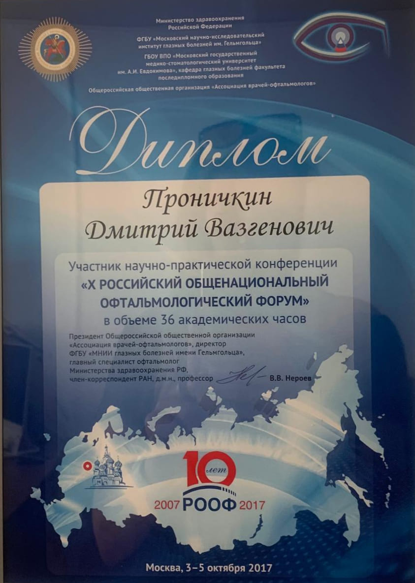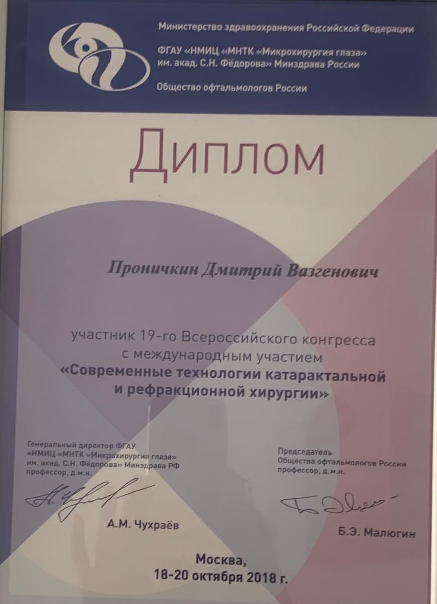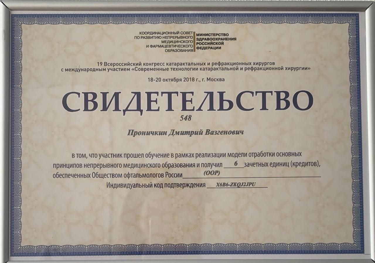 18.12.2015 года – удостоверение №682403249976 о повышении квалификации по дополнительной профессиональной программе «Офтальмология» — Федерального государственного бюджетного образовательного учреждения высшего профессионального образования «Тамбовский государственный университет имени Г.Р.Державина» медицинский институт