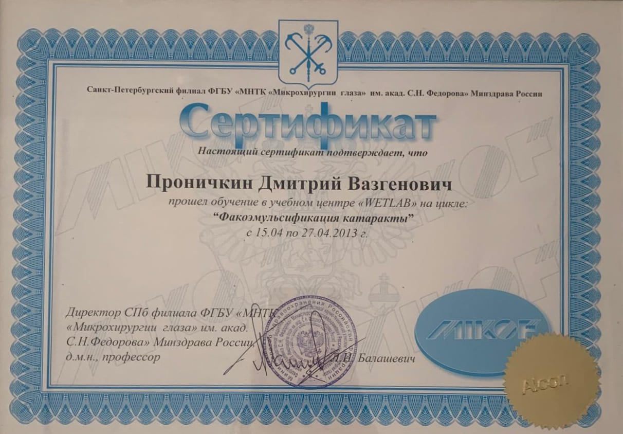 22.12.2015 года – Сертификат №0168240600199 по специальности «Офтальмология» — Федерального государственного бюджетного образовательного учреждения высшего профессионального образования «Тамбовский государственный университет имени Г.Р.Державина» медицинский институт
